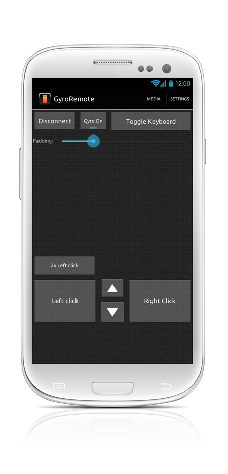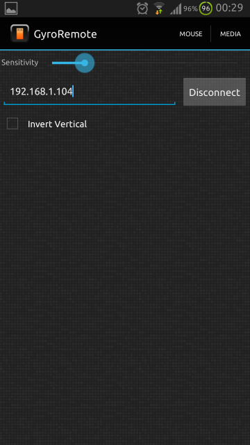 If tilted or rotated the phone will move the mouse. Adjust the sensitivity using the slider until it is confortable to use. To type or click you should go to the main interface by tapping on Mouse on the right top corner. To control a media player tap Media (the player must be able use global hotkeys).